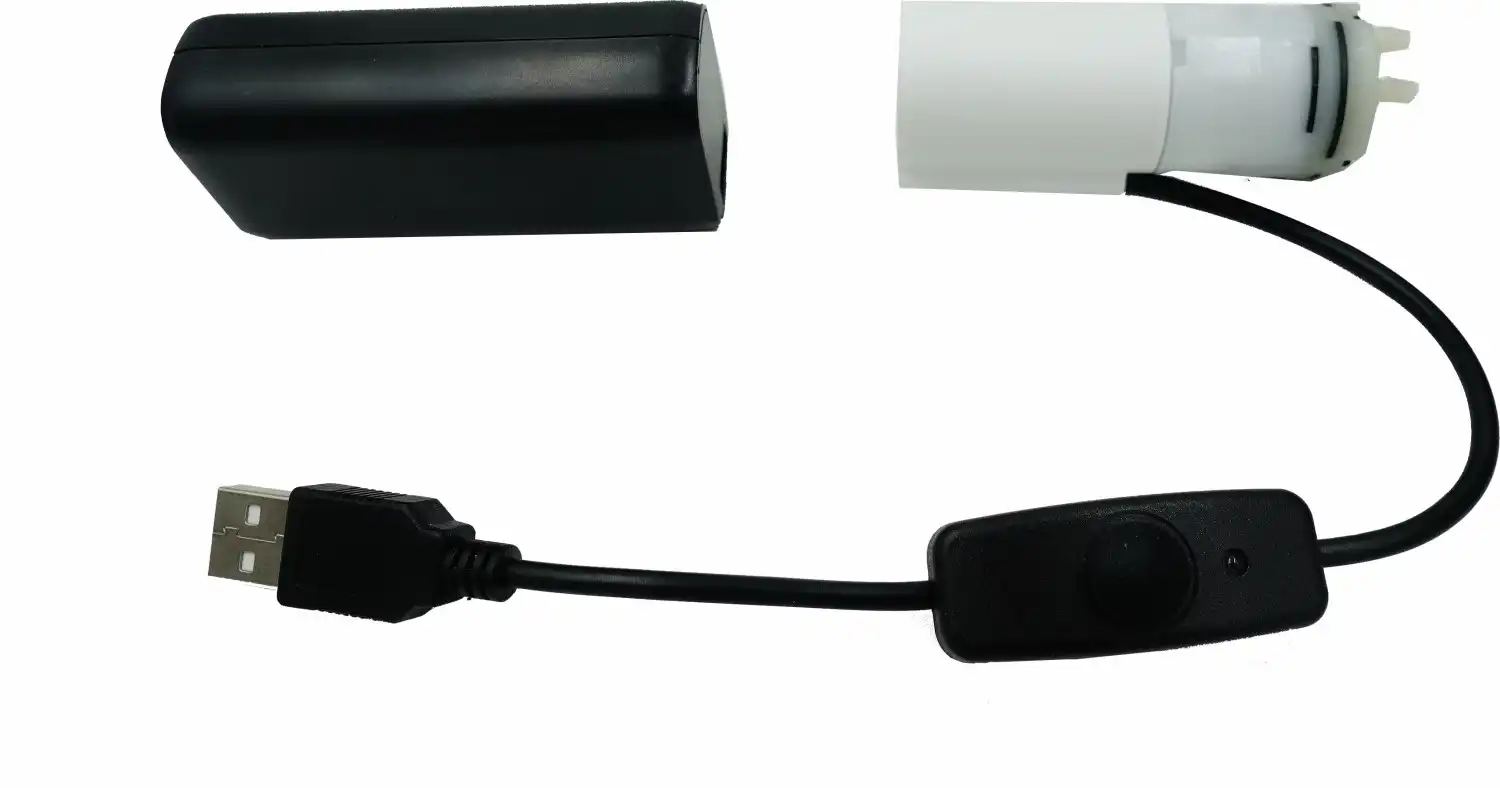 ポンプにUSBケーブルと中間スイッチを付けました。装着、取り出しは着衣ポケットに入れるだけで簡単です。
